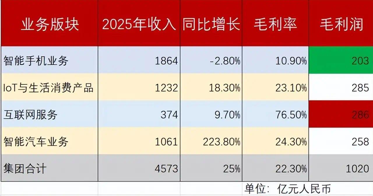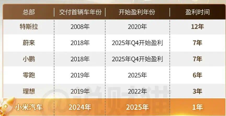 但是,小米创造了一个奇迹,2024年4月季度才交付第一辆车,但到了2025年底,就2025年三季度,就实现了季度盈利,而2025年全年,也实现了营业利润9个亿。