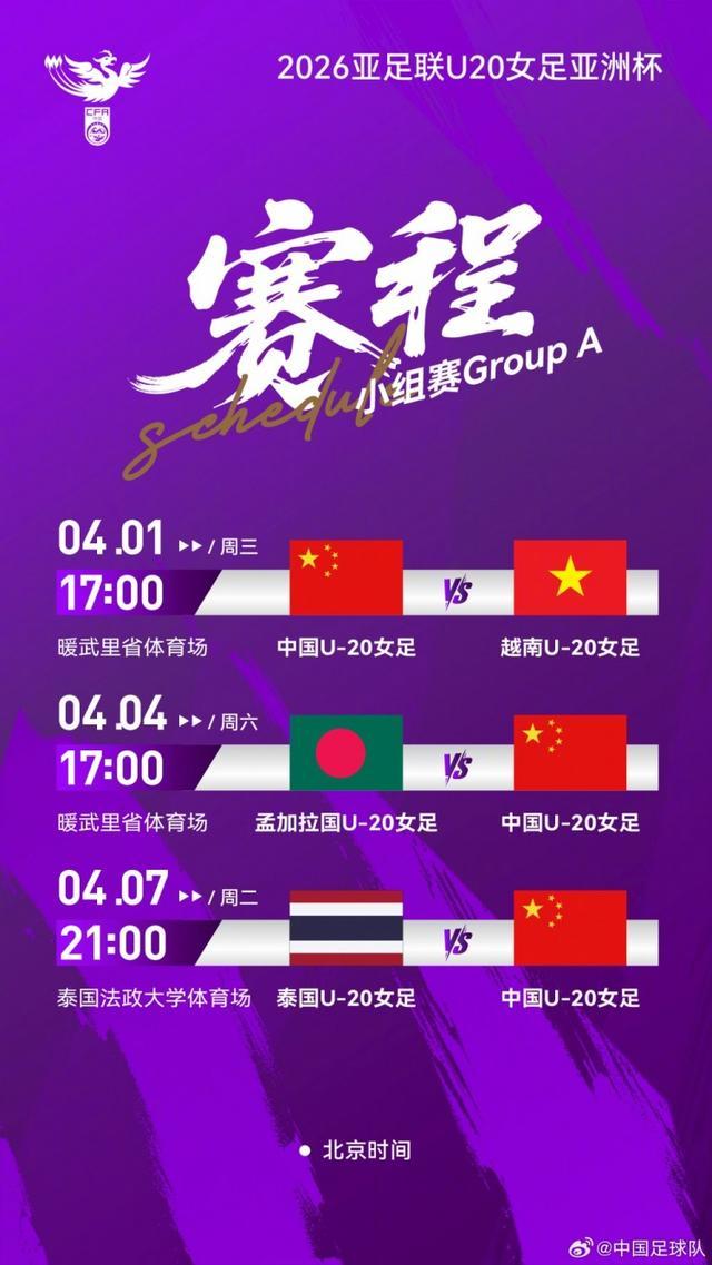 2026年U20女足亚洲杯将在泰国进行,中国U20女足小组赛首轮对阵越南队,比赛北京时间4月1日17点在暖武里府体育场进行,CCTV5+等平台直播。