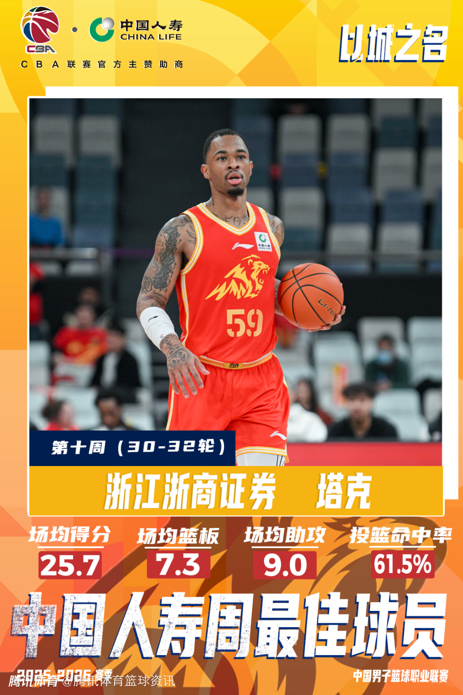 【塔克当选2025-2026赛季CBA联赛常规赛第十周中国人寿周最佳球员】